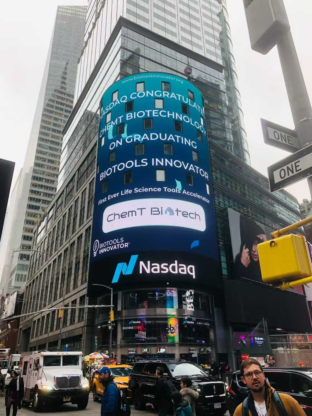 New York, Nov 2025 – ChemT Biotechnology was featured on the NASDAQ Times Square tower in New York, marking the conclusion of its participation in the BioTools Innovator 2025 cohort. The milestone reflects a year of rapid progress in advancing its AI-powered biotechnology platform.